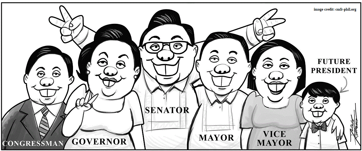 Let’s return to the mother who just reached her term limit as mayor. Would she go back to being a full-time mother and wife? You were born only yesterday if you don’t know the answer to that question. Yes – she would run for the post vacated by the husband-politician. The husband would then aim for a higher position – run as congressman or senator. If all family members win, then for years, the power will change hands within the same family. The son (or daughter) is a mayor, the mother a governor, and the father either a congressman or senator. When term limits are reached, they will just run for the position a family member would vacate. Some siblings, and even in-laws, in the family also occupy minor positions in their geographical units.