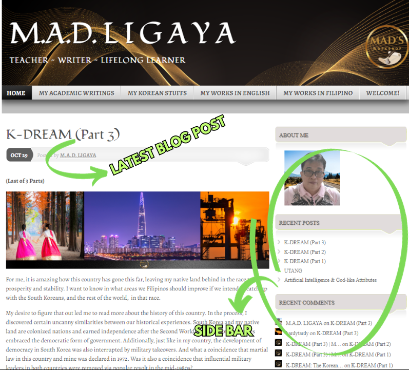 In the section My Korean Projects, I share my experiences as a Filipino expat and a teacher in South Korea. The four subsections are Korean Adventures (essays/commentaries written in English), Kuwentong Kimchi (essays written in Filipino), My Gastronomic Journey In Korea (articles chronicling my gastronomic journey here in South Korea), and Korean Dishes/Foods I Tried (videos and a brief explanation about the Korean dishes I have been enjoying in this country).